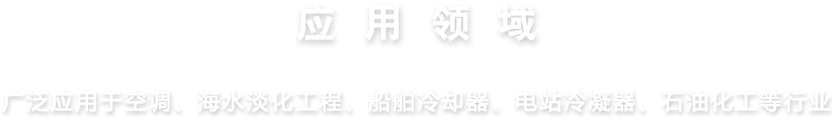 包括工業制冷機組,船用空調,熱泵空調,容積式熱水器,泳池換熱器,冷凍式集裝箱換熱器;電廠凝汽器,船用熱交換器,壓縮機冷卻器,石化煉油廠冷卻器,電機冷卻器,海水淡化蒸發器,船舶修造改裝,海洋工程,中央空調,石油泵管等工業領域